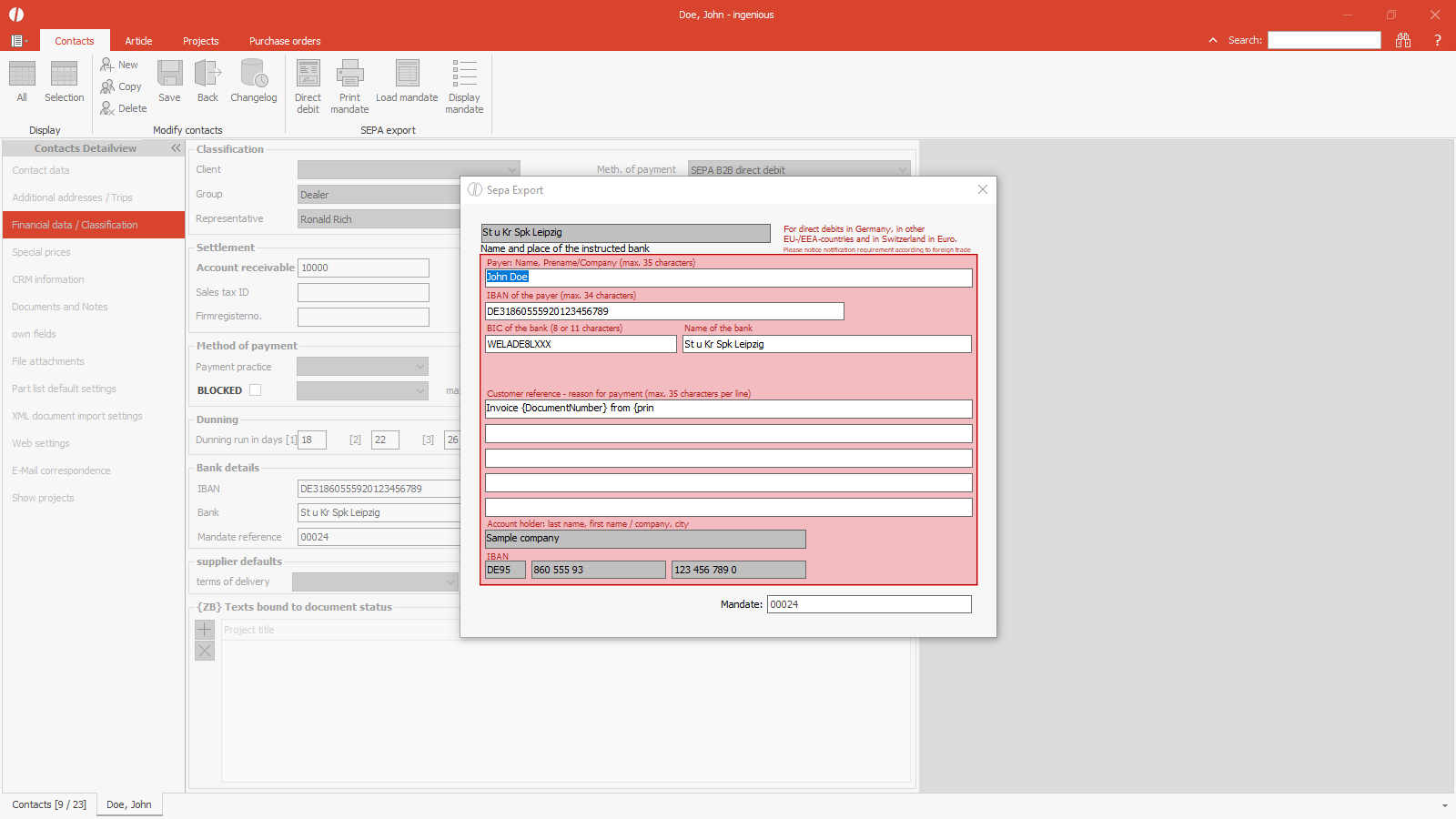 If a customer issues a mandate for SEPA corporate direct debits, these direct debits can be generated by ingenious from the invoice data. The prerequisite is the storage of the account data and the mandate reference in the contact details. The mandate reference is a unique number under which the direct debit along with other details, e.g. the invoice number can be clearly identified. The mandate reference can be assigned automatically by ingenious via its own counter or it is entered manually.