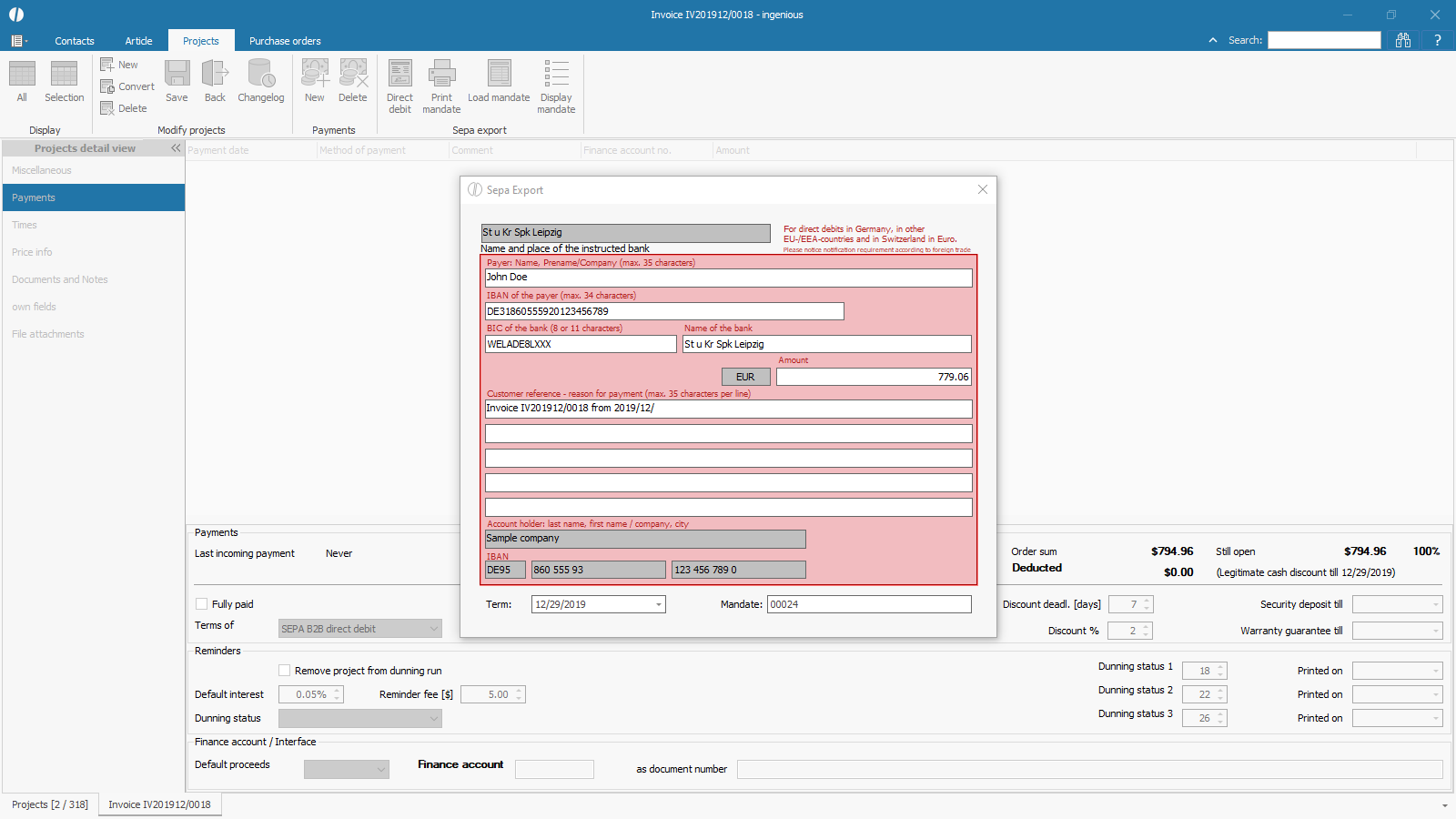 In a project document (invoice or order confirmation), the preview of the direct debit in the typical form is also available when the assigned payment method is selected. Details can be added or corrected here.