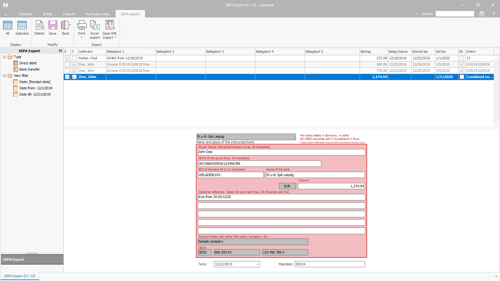 The SEPA export module provides an overview of all open SEPA data records from the outgoing and incoming documents that have not yet been exported.