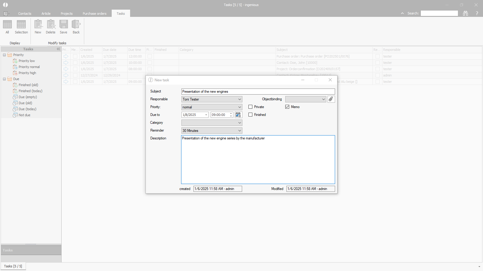 A task bound to an object can also be created directly from a detail view in the main modules via the  button.