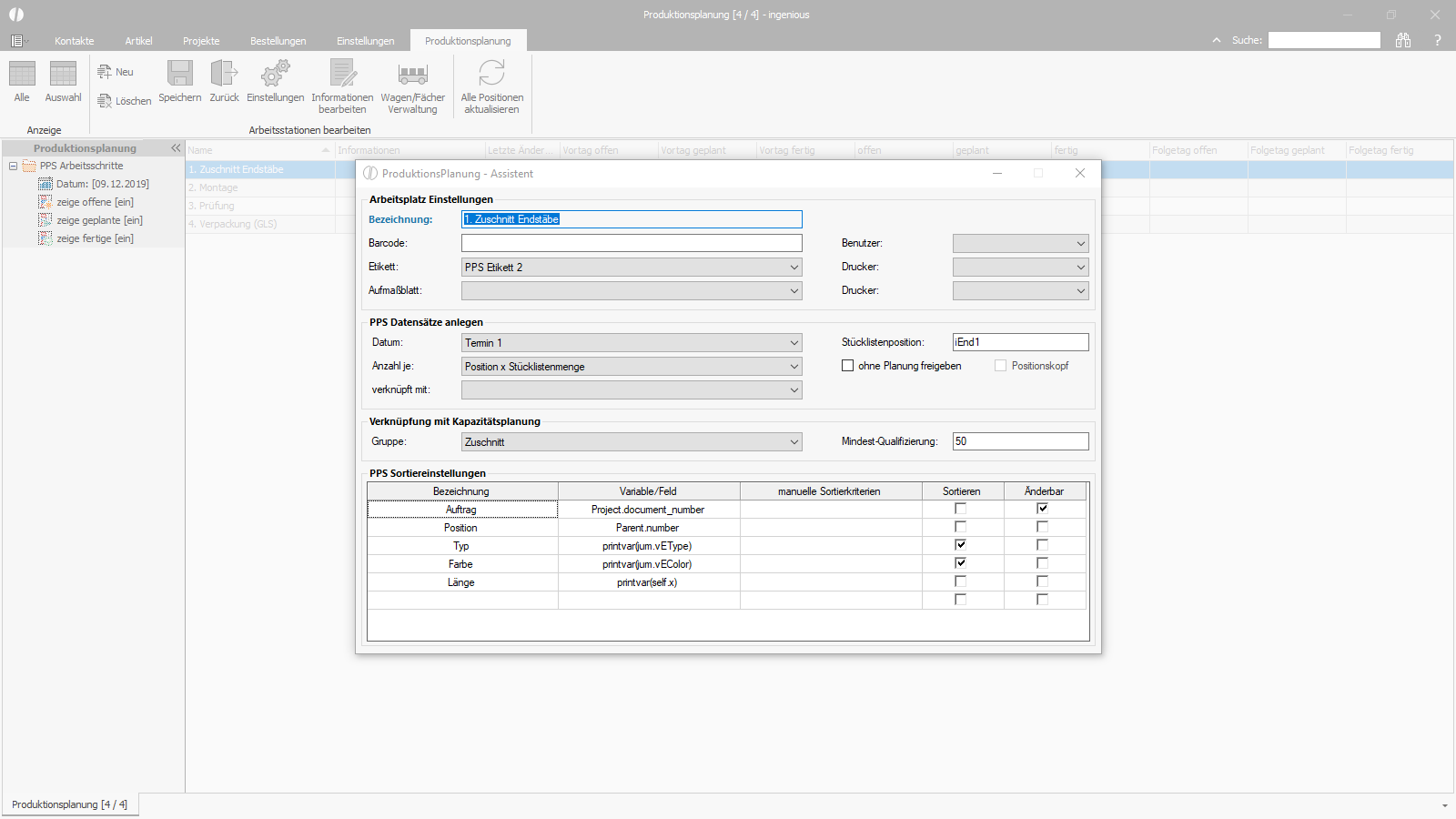 of the icon bar. The production planning assistant is opened, where the relevant settings can be made.