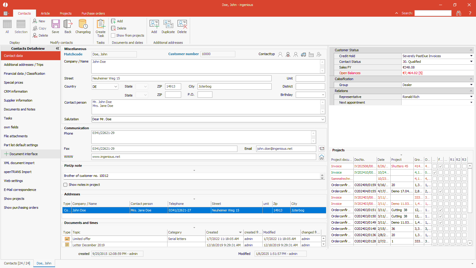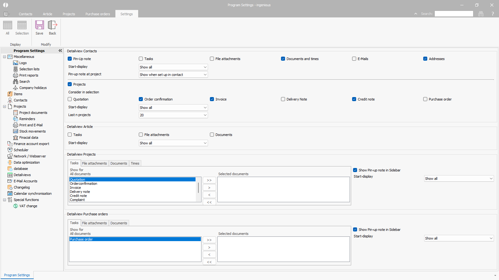 In the detail views of the main modules, on the respective first pages, additional documents can be displayed next to the miscelleanous data, on order to capture the most important details immediately without having to switch to the subordinated forms.