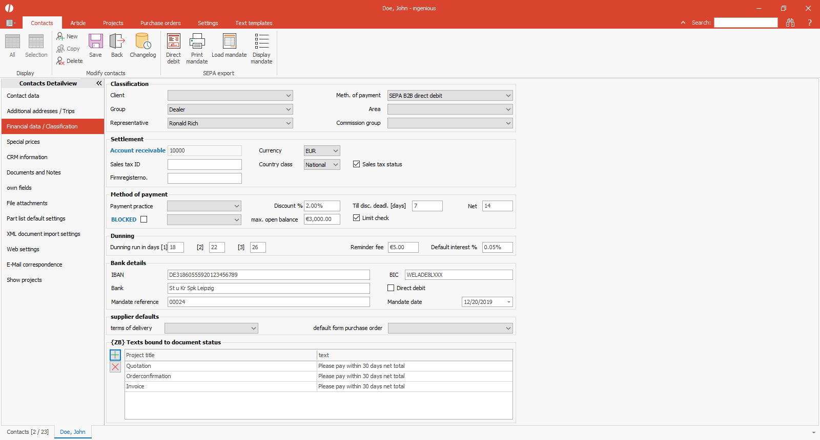 For the contact types and the terms of payment, the mapping is defined in the program settings and can be changed at any time.