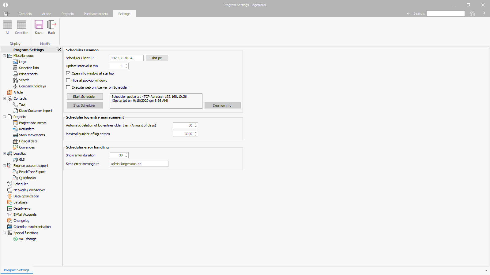 Via the scheduler, individual functions of scripts can be executed time controlled. In the program settings it is defined, among other things, which pc hosts the scheduler.