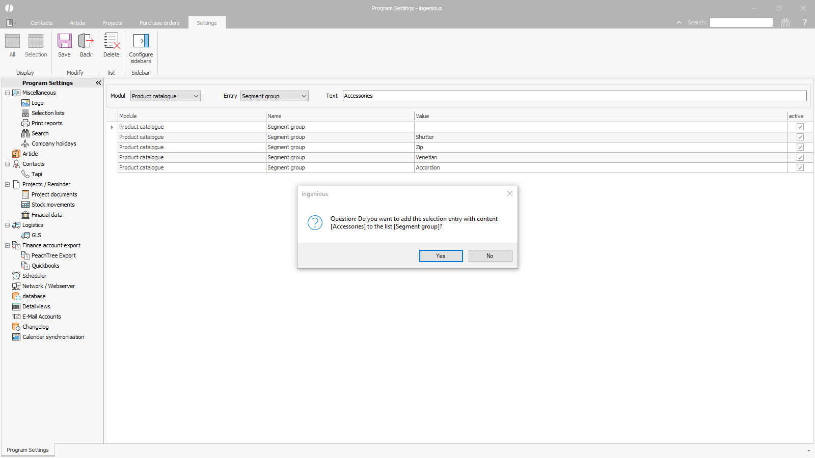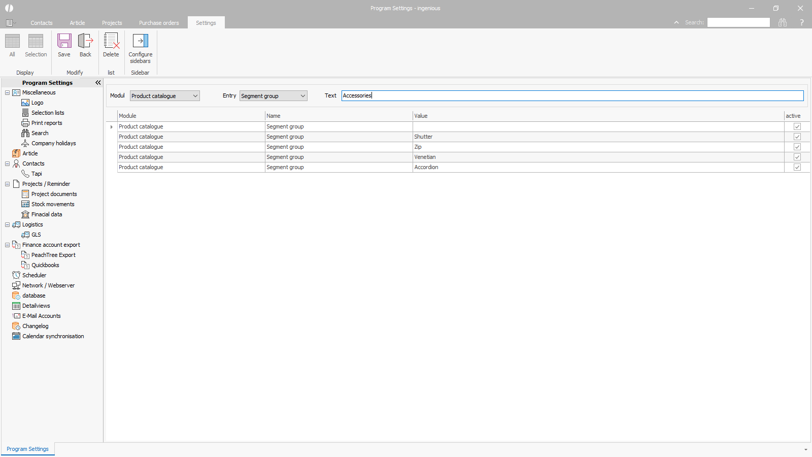 The sidebars are individual form templates, which can be displayed in the miscellaneous data of the detail views of the four main modules “contacts”, “articles” and “projects” and “purchase orders” and their positions. In the templates, often applied mistakes of other navigation points and own defined fields can be displayed and modified.
