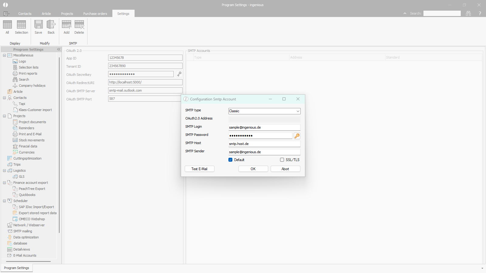 Starting with ingenious version 5.0, multiple SMTP accounts can be configured in the program to use different sender email addresses for different applications. For example, a script can reference a specific SMTP account, or a separate sender address can be selected for each user (see Miscellaneous user details).
