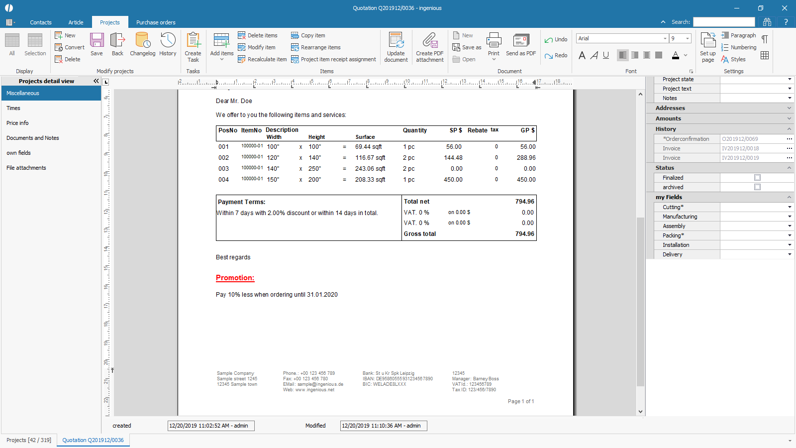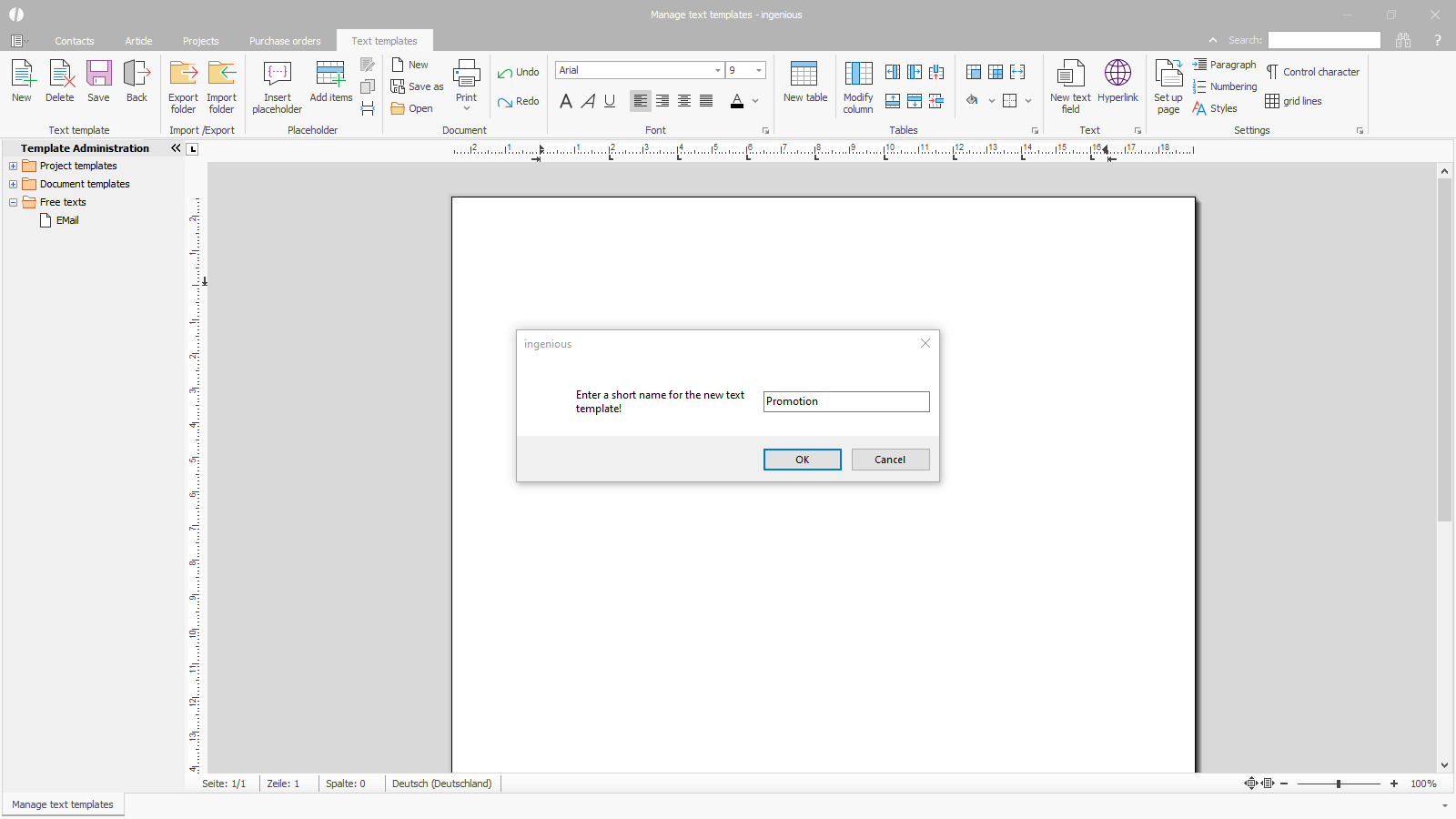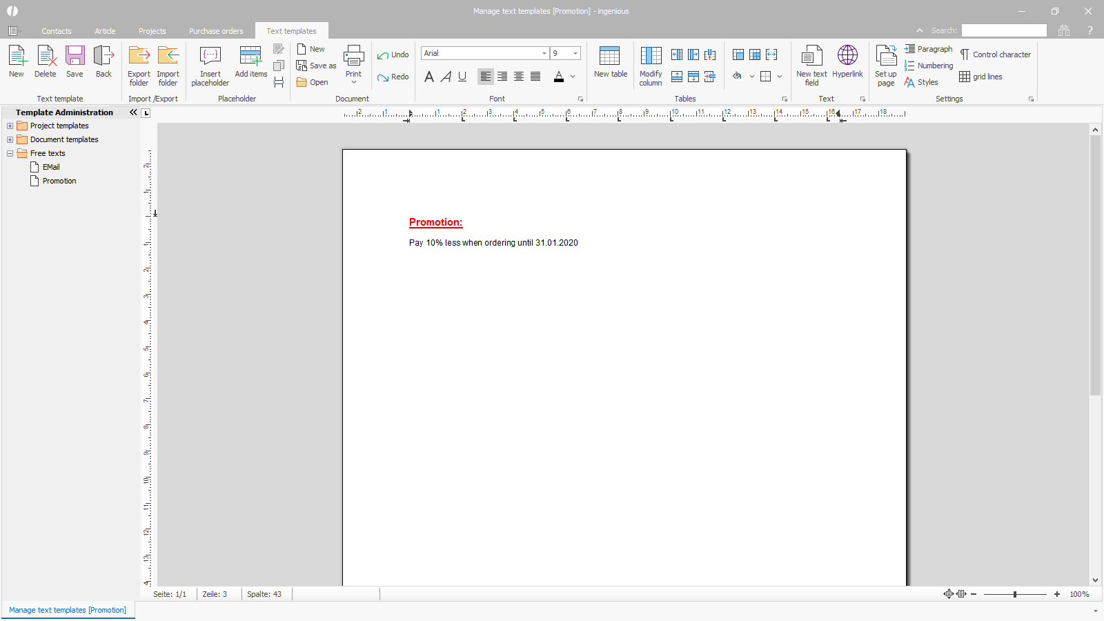 Free texts can also contain placeholder and scripts. These are dissolved singularly during the entry into the document.