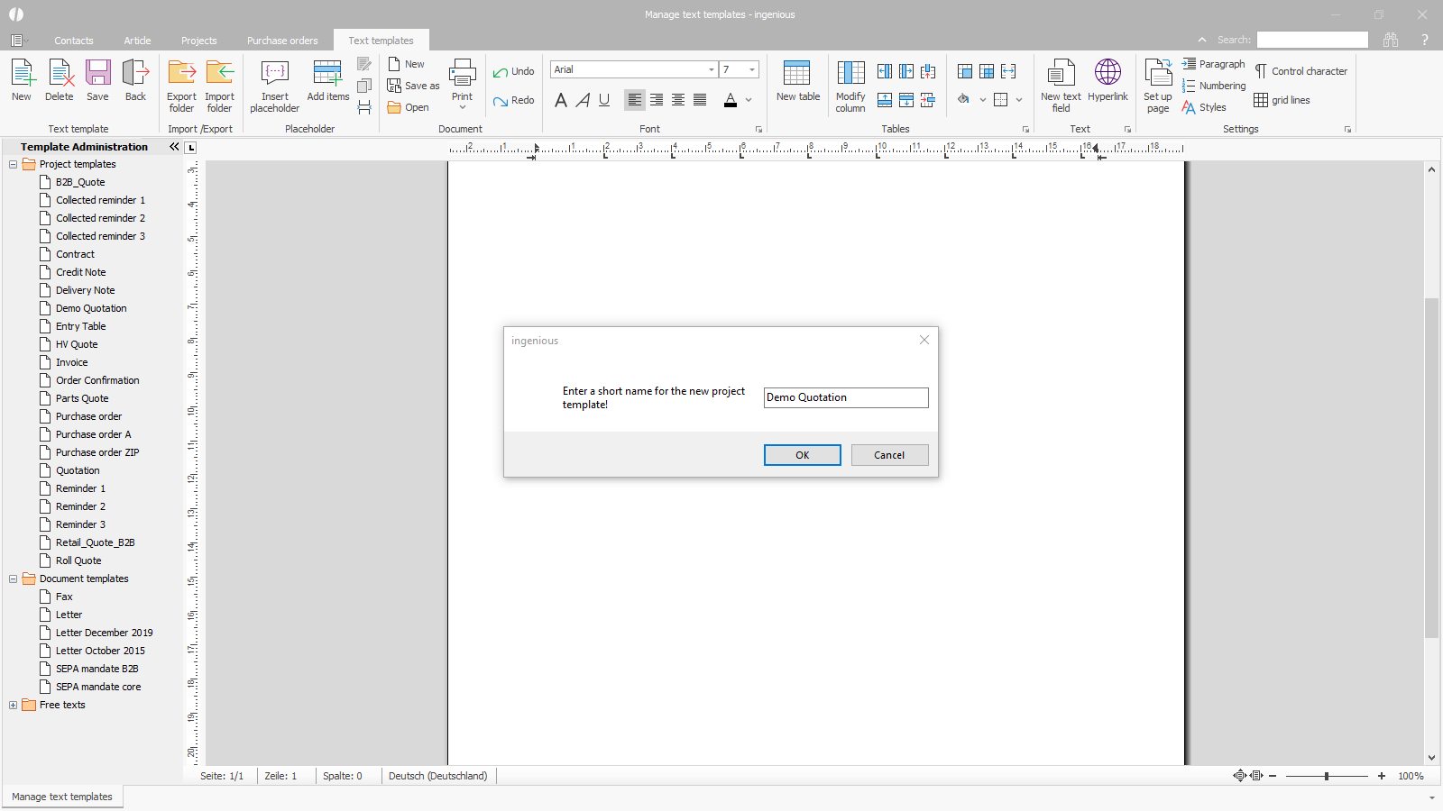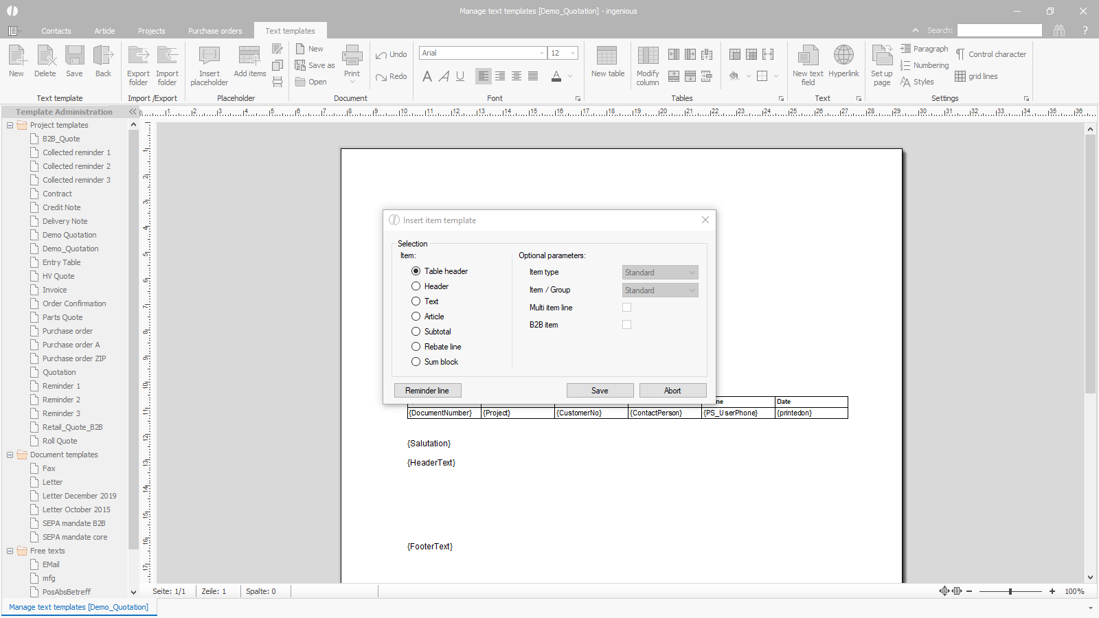The other positions are inserted after the respective selection below the table header automatically and contain the same number of columns as well as predefined placeholders such as article texts and prices.