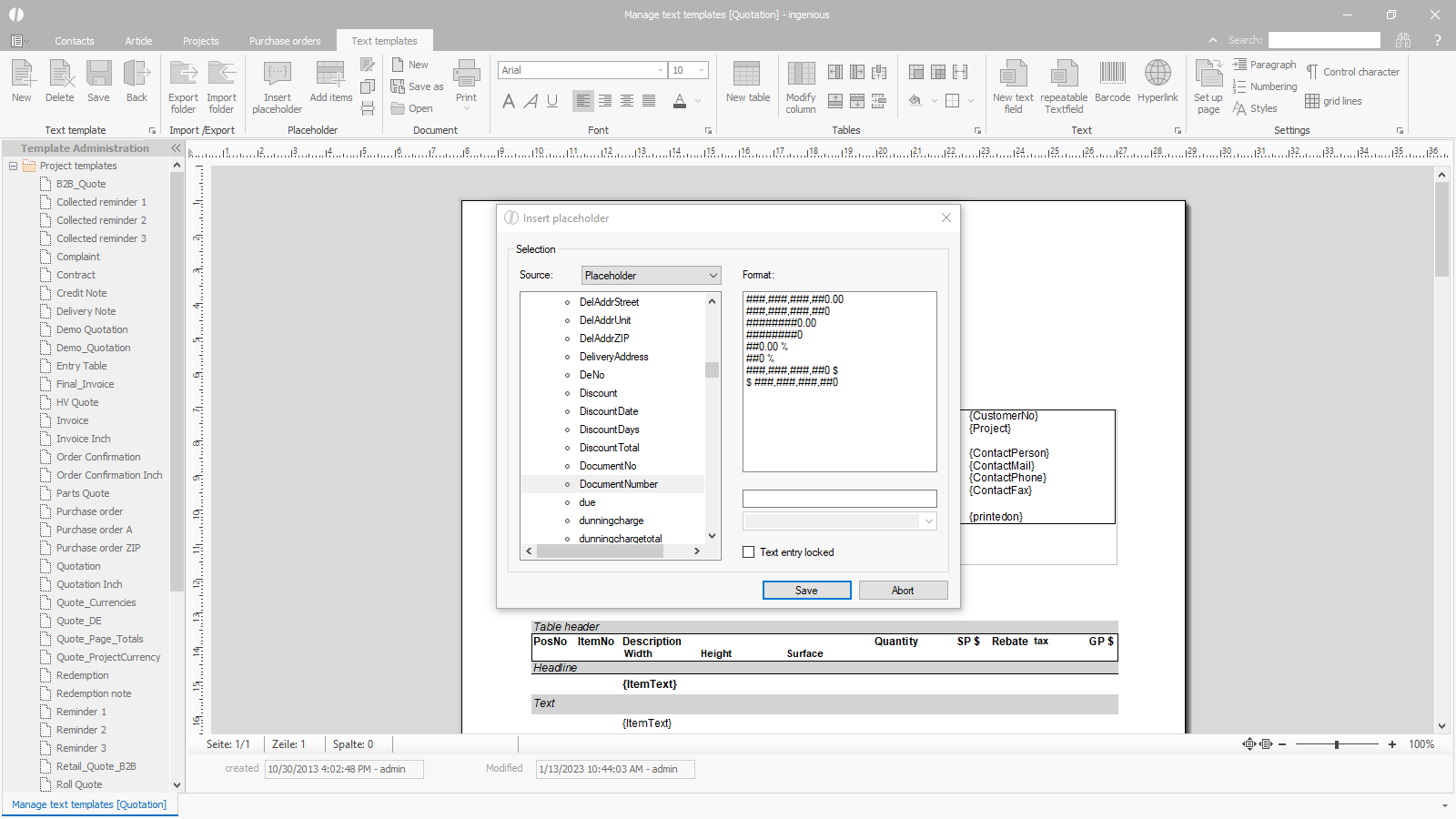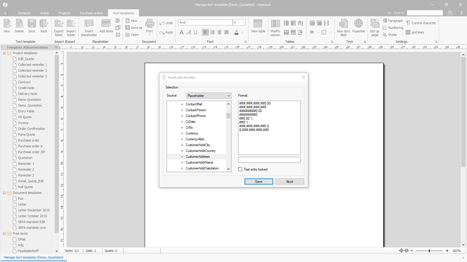 Further details about the positions can be added via position placeholders, A new position placeholder is inserted via the  button. Tooltips (short descriptions), which are displayed when the mouse cursor points on the respective placeholder, help with the selection of the desired placeholder. On the right, single positions can also be formatted differently. The checkbox “text input blocked” determines, if the respective values can be overwritten in the project or not.