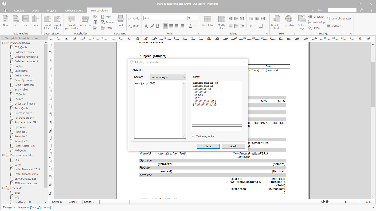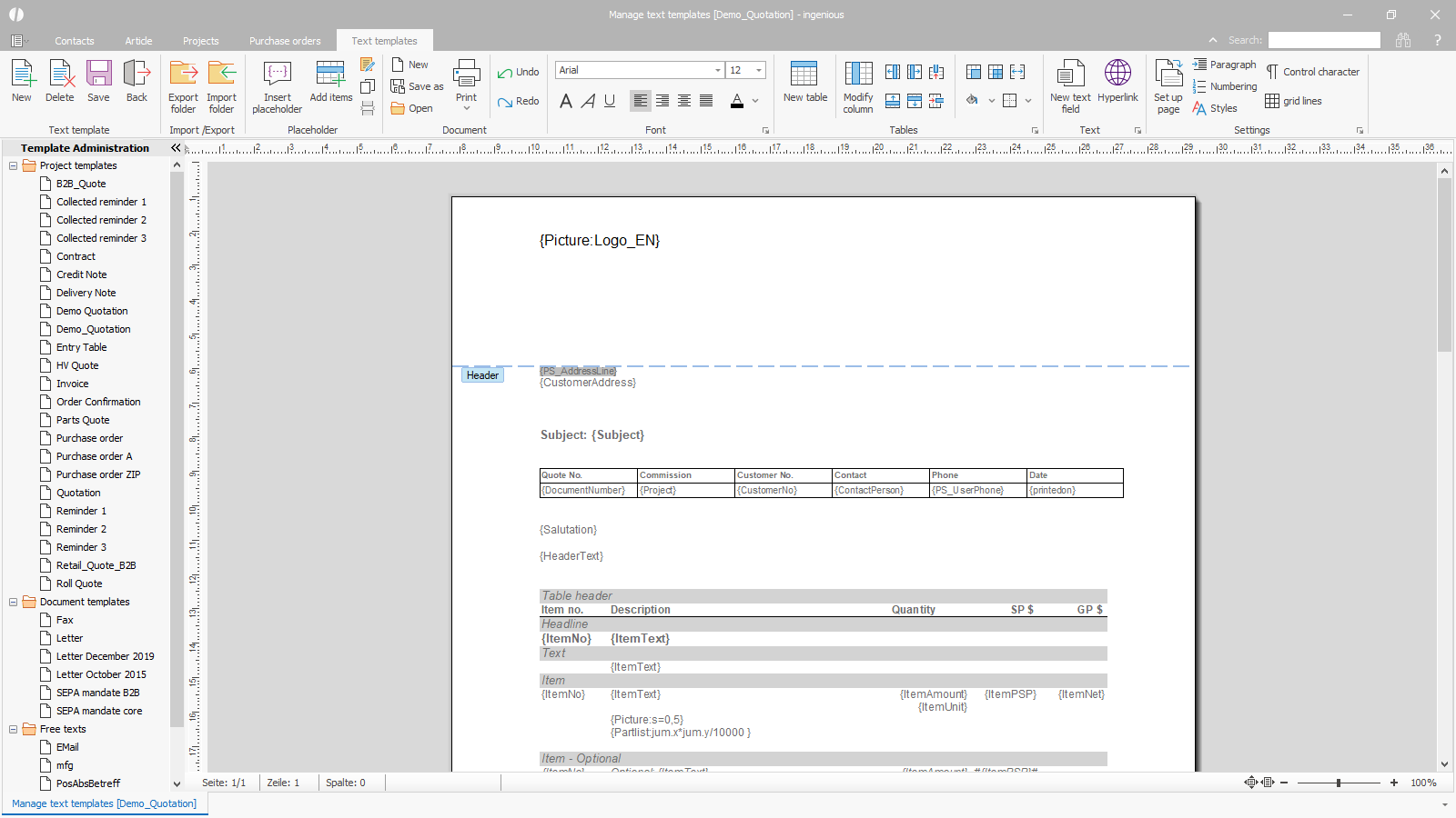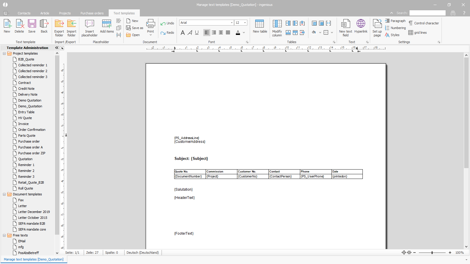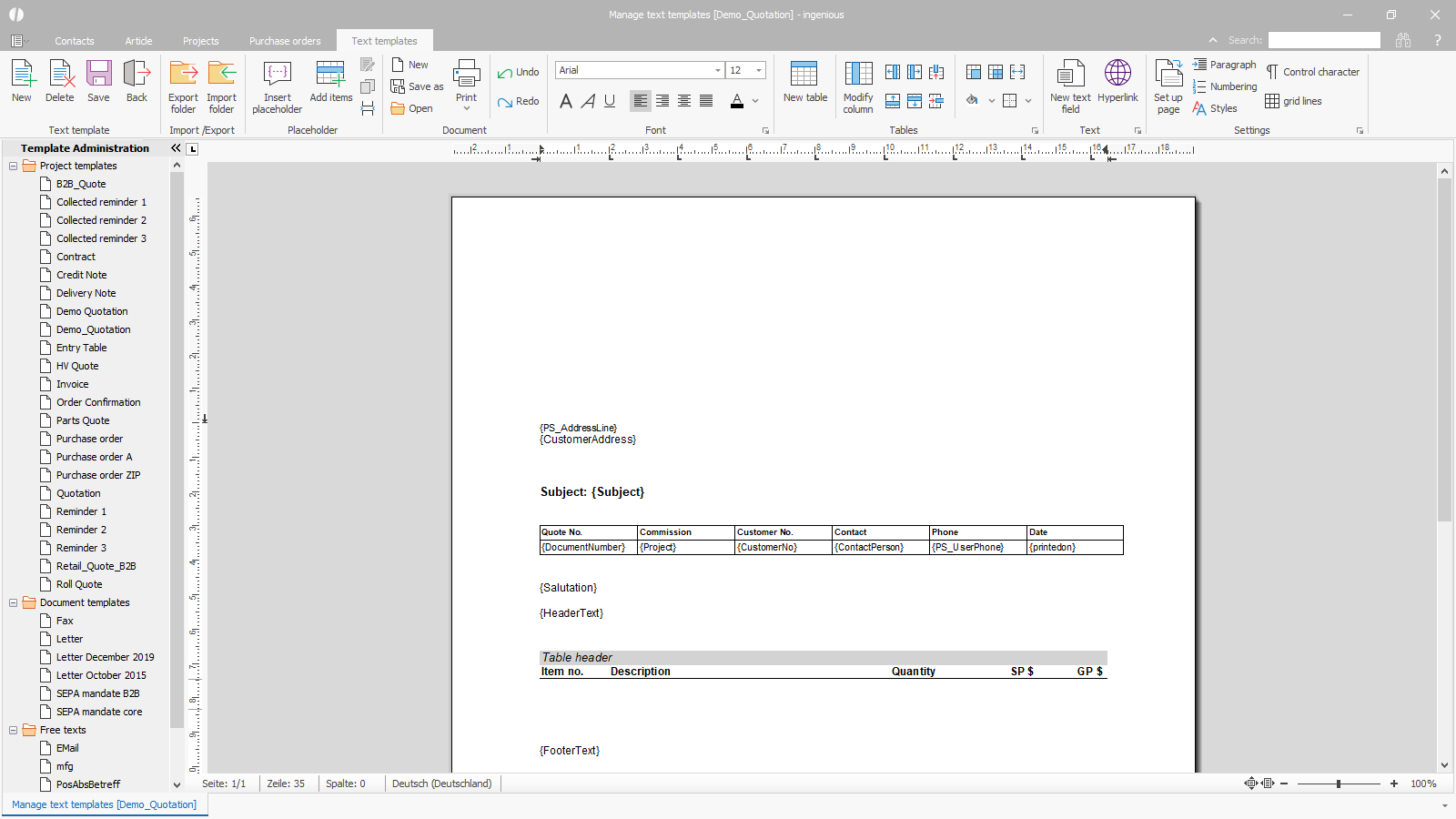 The texts can be stored in the template as standard using the “Free Texts” placeholder.