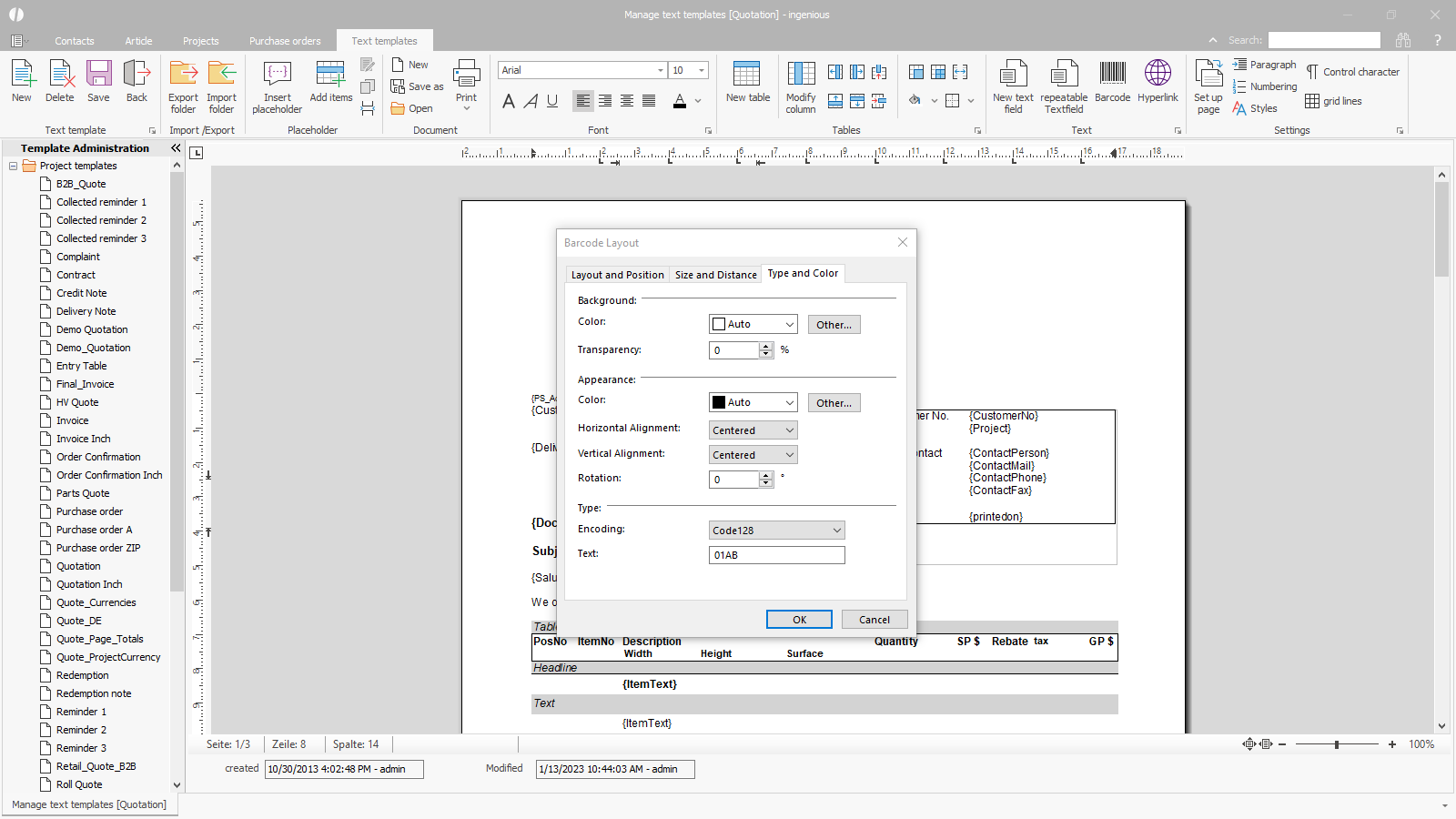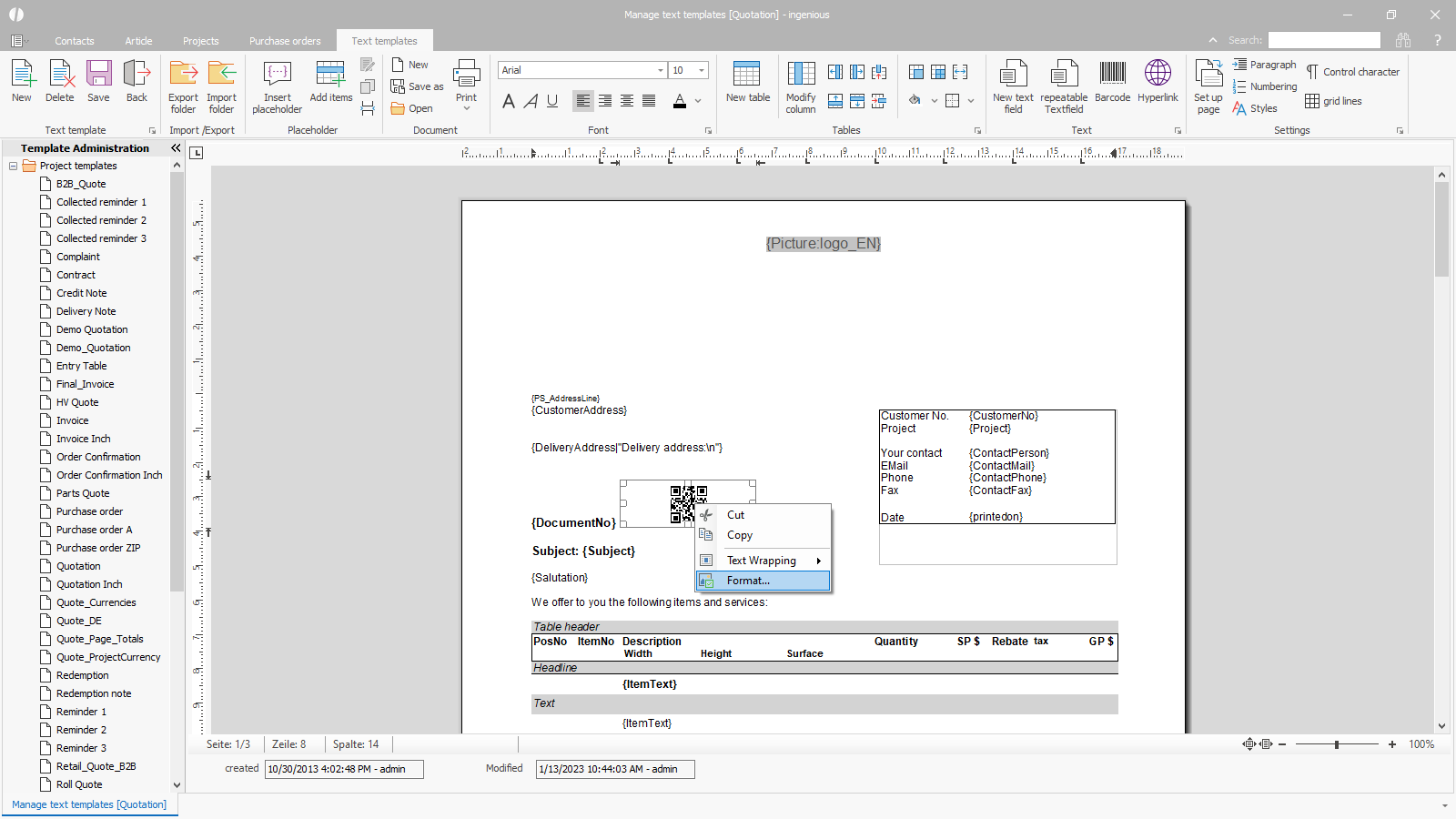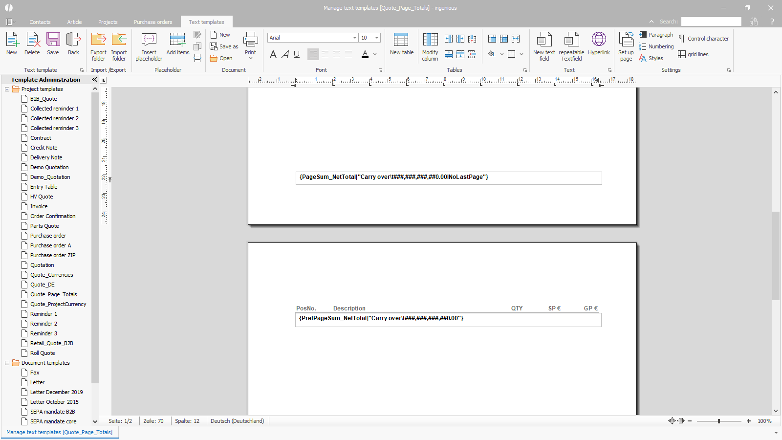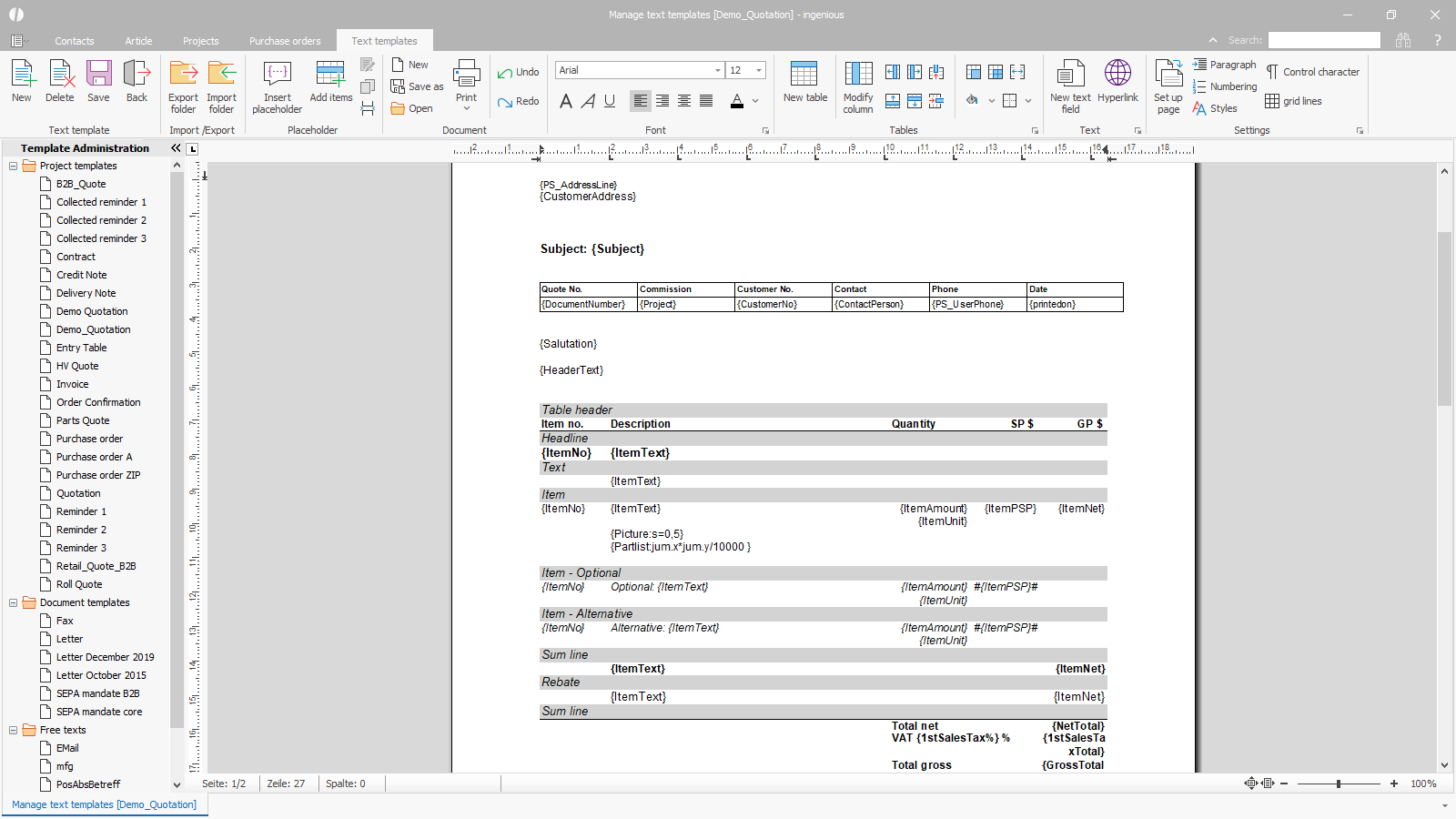 The texts can be stored in the template as standard using the “Free Texts” placeholder.