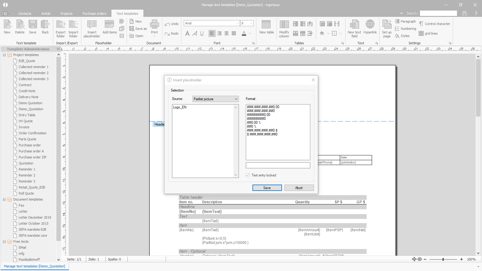Via the placeholders, also pictures recorded in the data base can be saved or generated via picture scripts and inserted into the project document. General picture placeholder can be inserted at any place in the project template e.g. the company logo in the header of the document. These general picture placeholders are  from the program settings / logo.