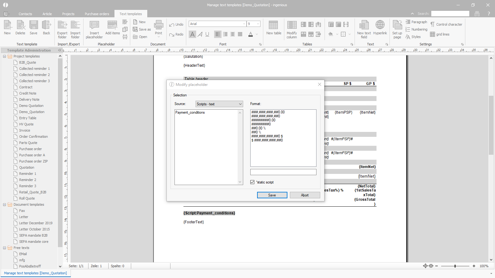 Another placeholder type are scripts. These are small separate formulas, conditions, etc., with which evaluations for the project or assigned contact can be created. The result is inserted into the project document using the placeholder.