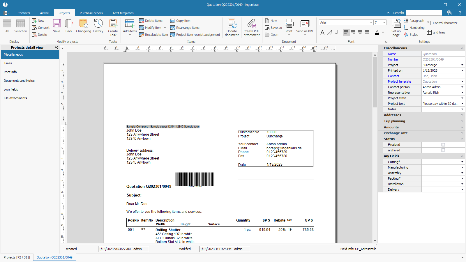 Project documents contain general placeholders such as e.g. address of the contact, who shall receive the document, information about the internal representative etc.