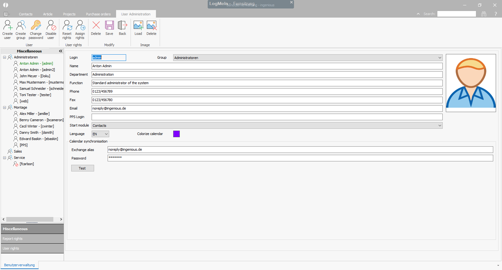 When the user administration is opened, all general data of the user who is currently logged in are displayed. In the navigation area on the left, on the one hand, all users in their assigned groups are listed with their names and logins in square brackets. User who are currently logged in are displayed in green. Through clicking on the respective names one can switch between the single users. The detail view always refers to the currently selected user.