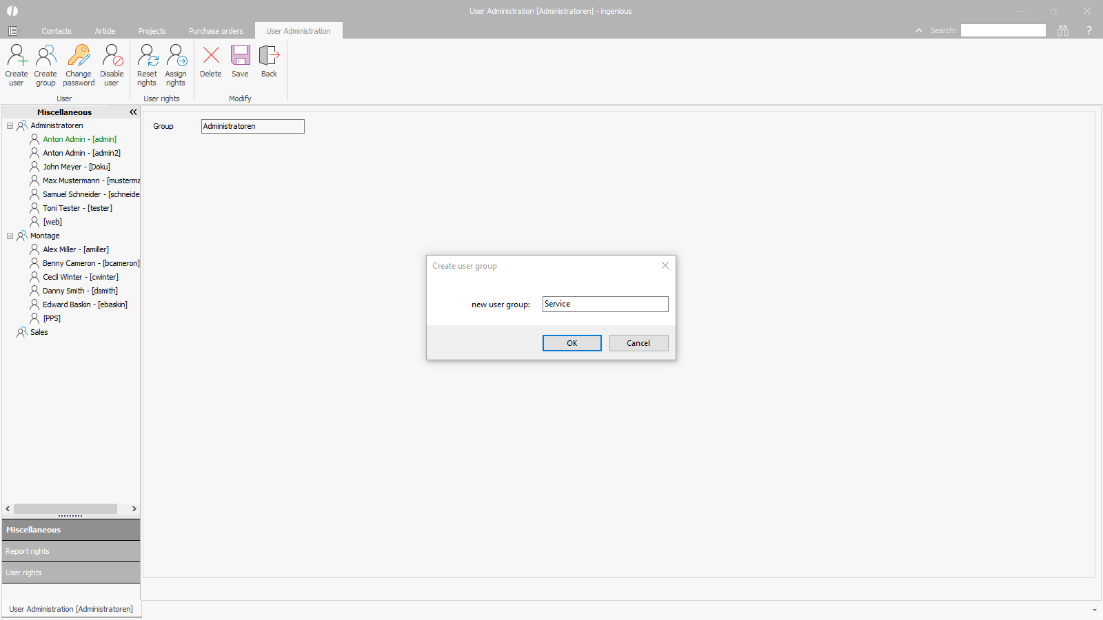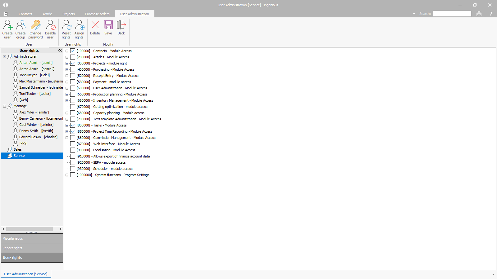 Subsequently, the user and report rights can be determined and assigned to all users who are created in a group.