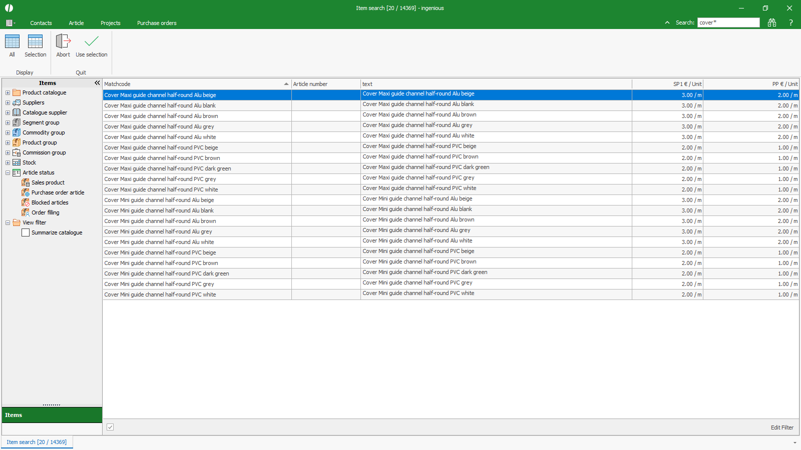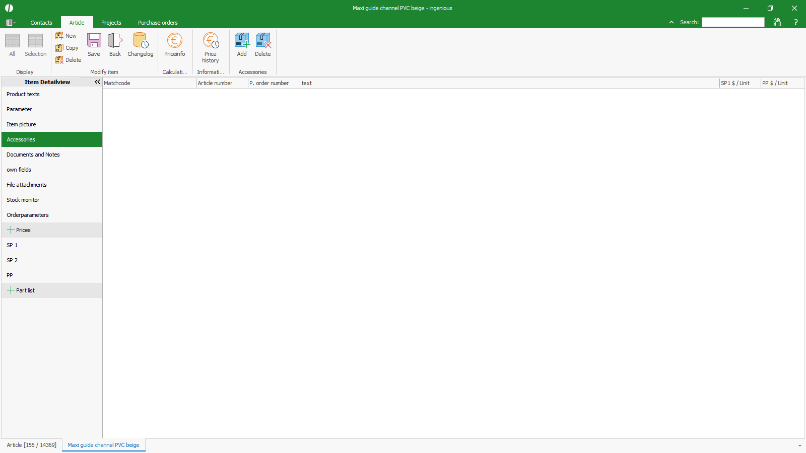 To add new accessories a list view of the articles is shown after click on “Add” button. Multiple articles can be selected with Shift or Ctrl + mouse click.