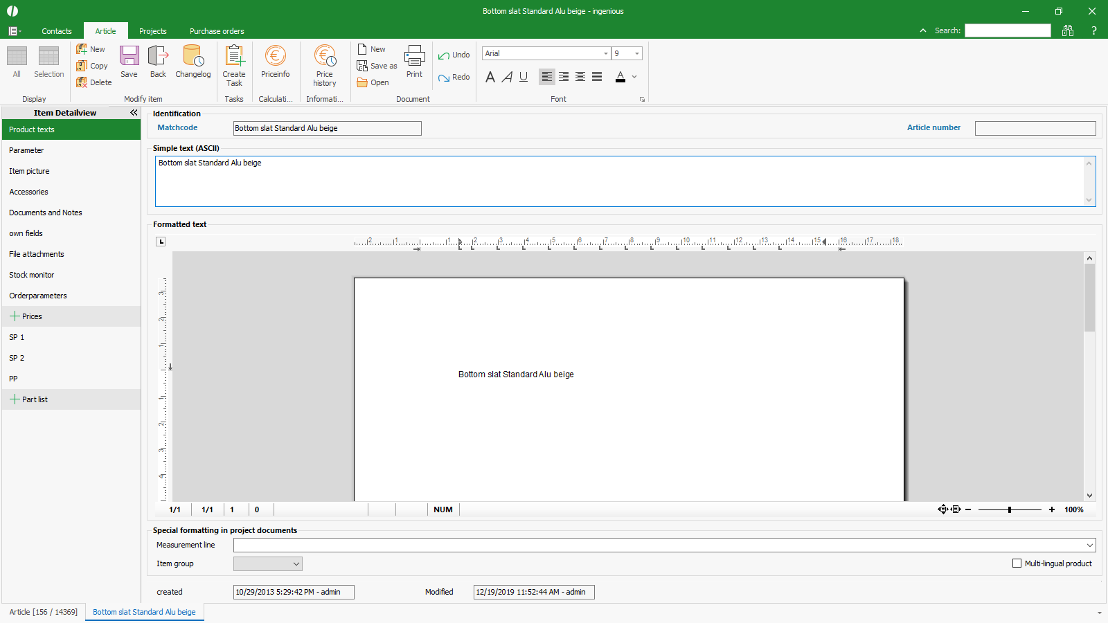 | Formatted Text | Multiline input field with editor | The formatted text is the description of the article as it should be printed in project documents (like quotes, invoices,…). The text can be freely formatted and will be taken over to the project document as it is. |