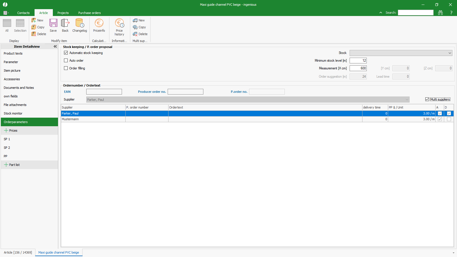 In the order parameters all details are stored that are relevant for a purchase order of the article: