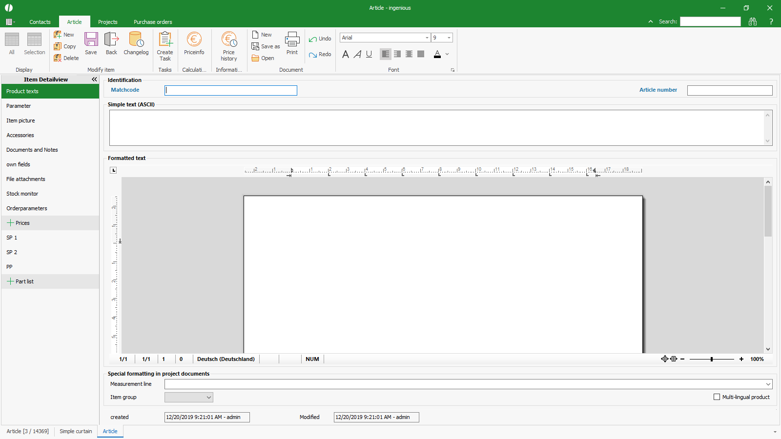 . An empty form is opened, where all available data of an article are filled in. The secured fields like matchcode and articlenumber are free editable for the first input. Afterwards the fields are locked to avoid changes by mistake. Anew modification is only possible after double clicking the blue field title.