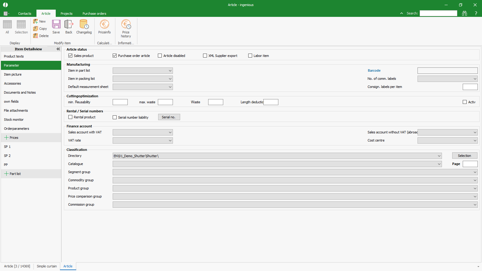 Each new created article is automatically identified as sales product and purchase order article. Additional values are not preallocated.