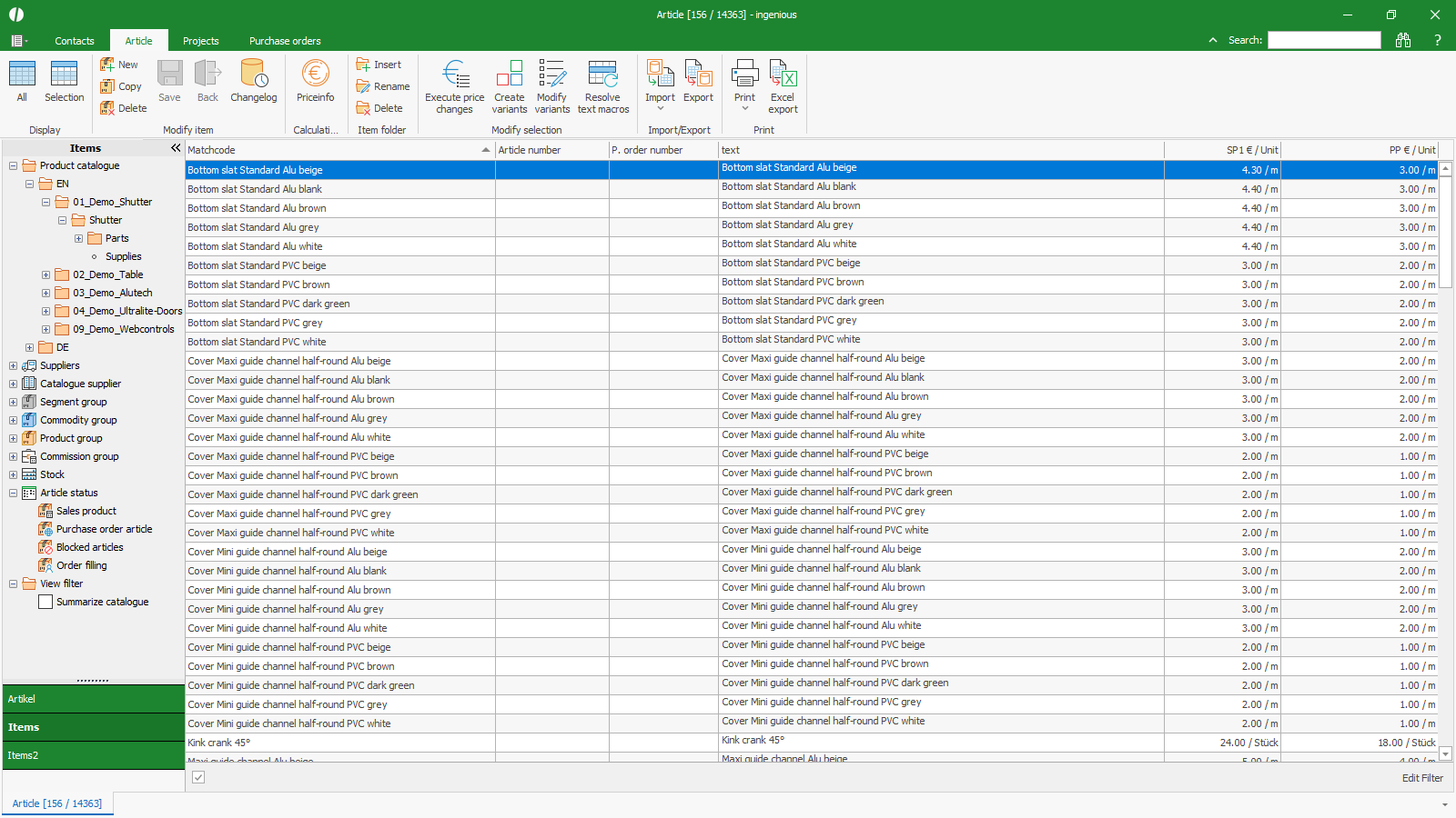 | Suppliers | Immediate filter from contact linkage | Within the group suppliers all matchcodes of contacts are listed that were created in the database as contact type supplier. All assigned items, for that the supllier was selected in article details are shown in the list view immediately when the supplier is clicked on. |