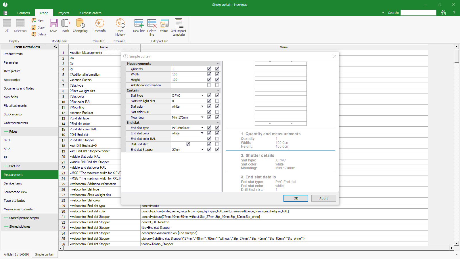 The view Measurement is mainly available for part lists that was imported from previous ingenious programs. In this compatibility view the checklists can be modified in the familiar way.