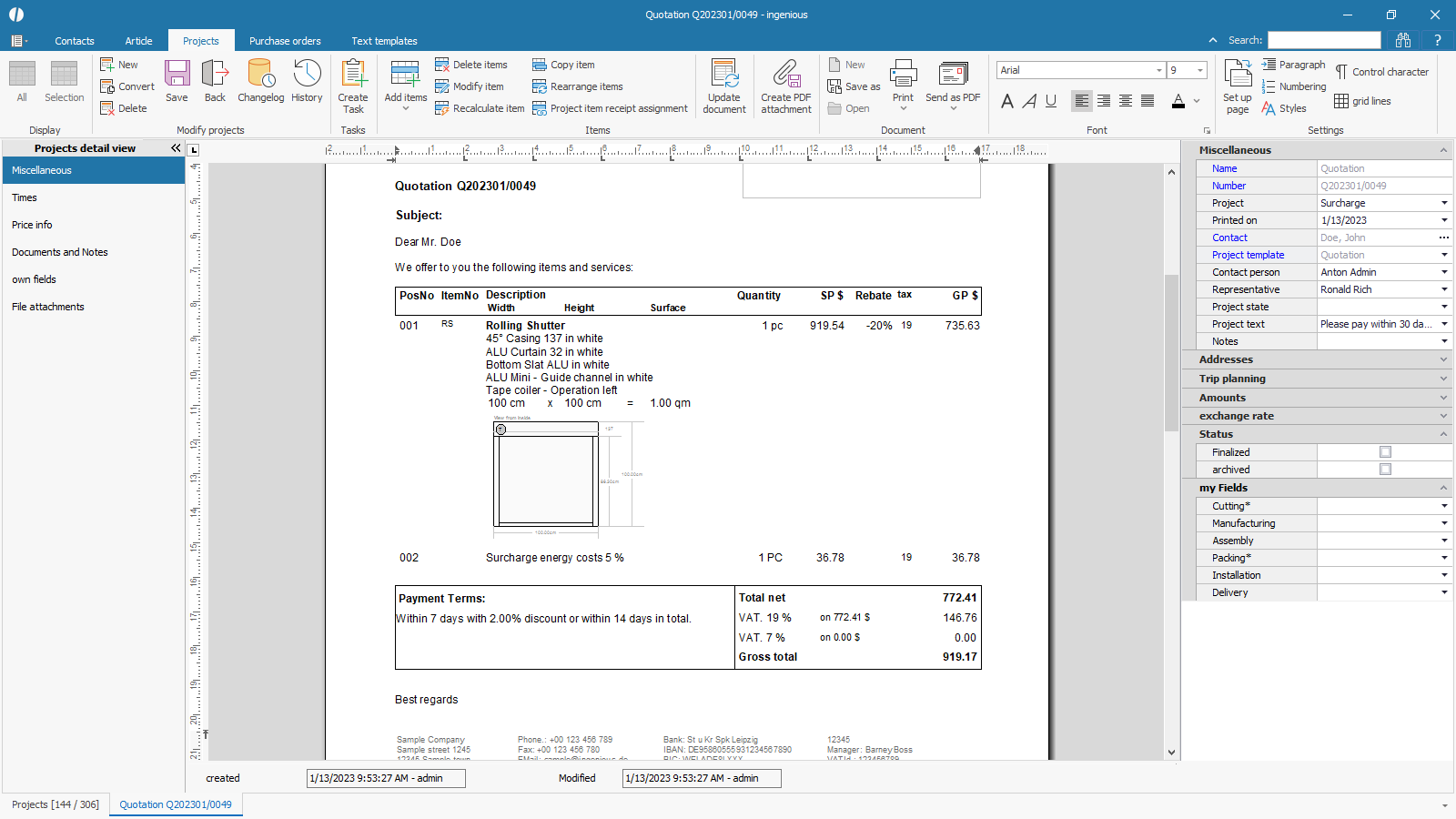 Once a surcharge is configured, it is automatically inserted into each project document.