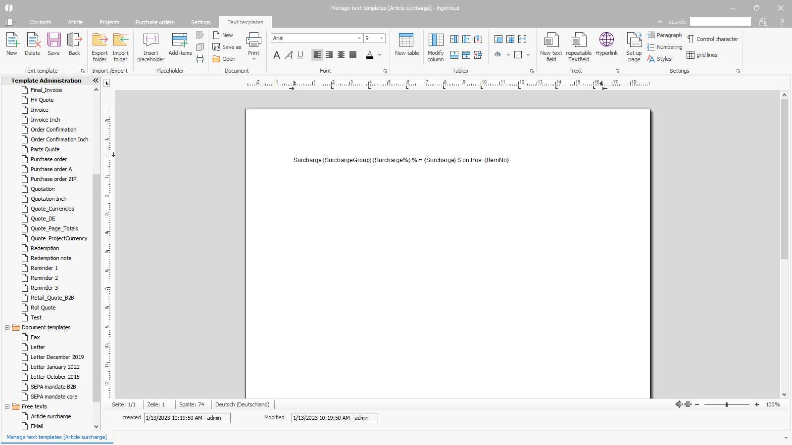 This free text template is to be set in the program settings / items as position text for the surcharge.