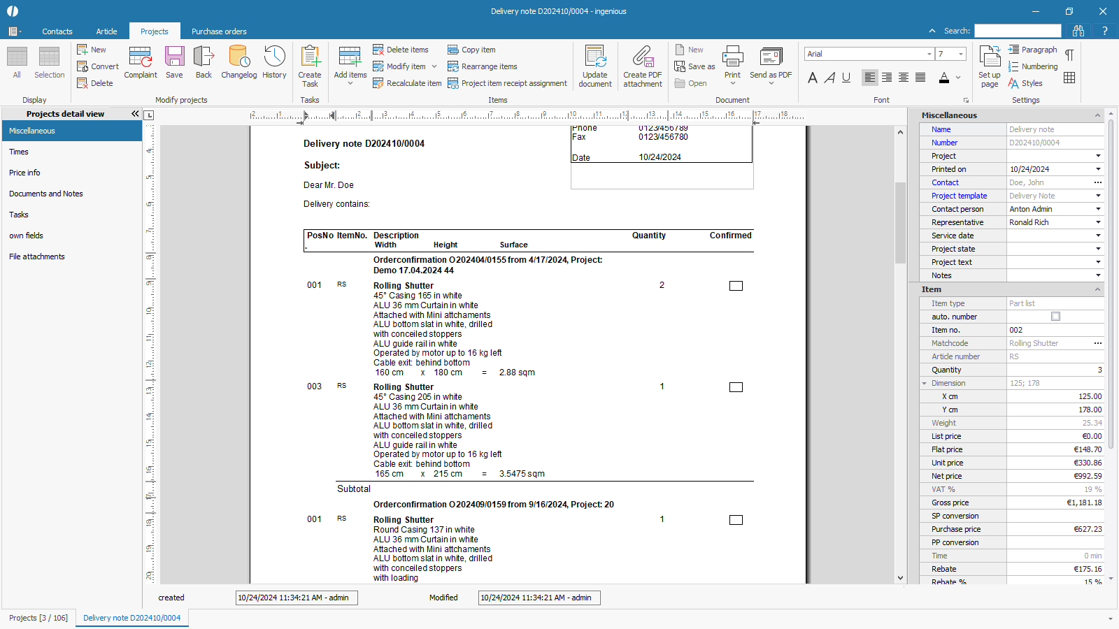 | Add lot sum per project | A lot sum represents the end of the positions of an original project. The lot sum is used, for example, when a combined invoice is created from combined delivery notes and the delivery notes themselves already contain subtotals from the combined orders. The lot sum contains the text “Lot sum” by default, but can also be created individually with placeholders and static text in the free texts. |