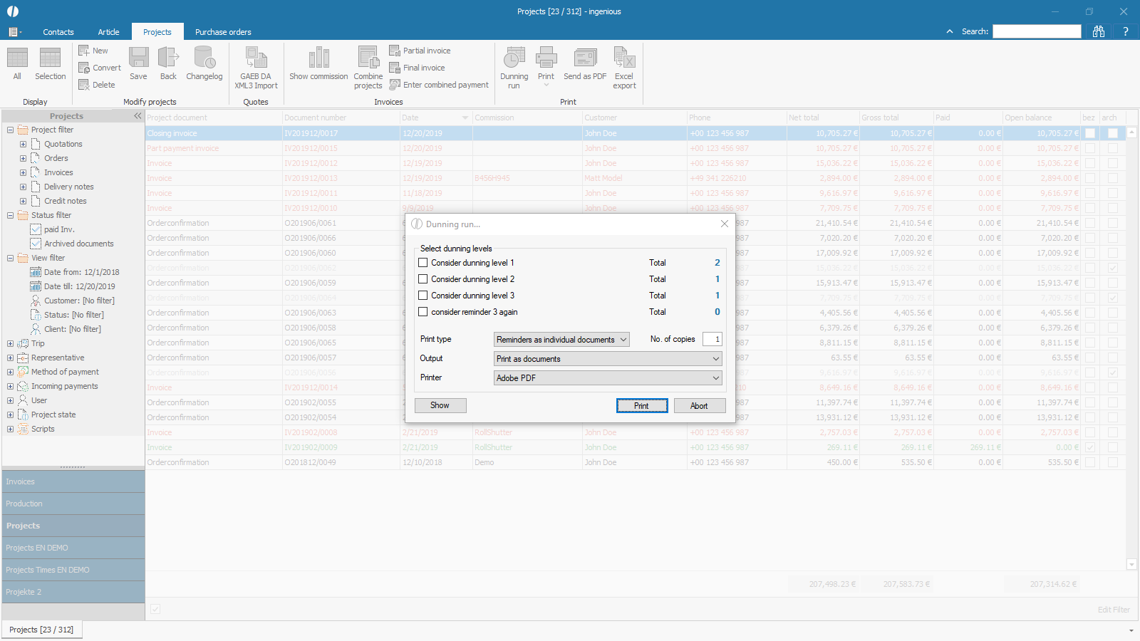 In the appearing window the user can select which dunning levels should be included. The reminders can be printed directly or the user can first check the related invoices by clicking the button “Show”.