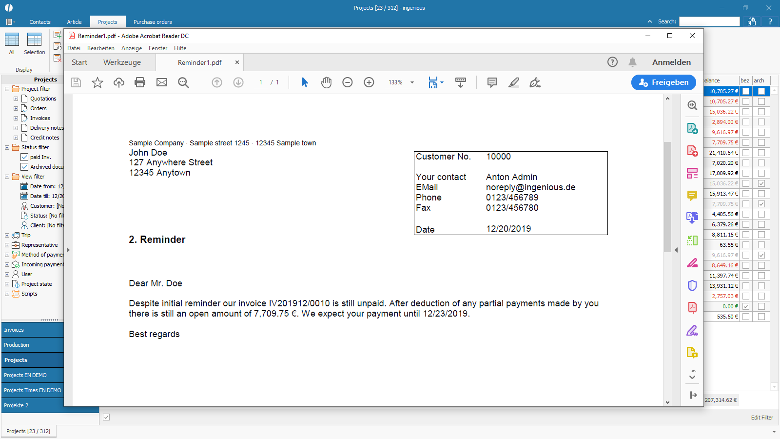 For option “individual documents” a single reminder document is printed for each overdue invoice.