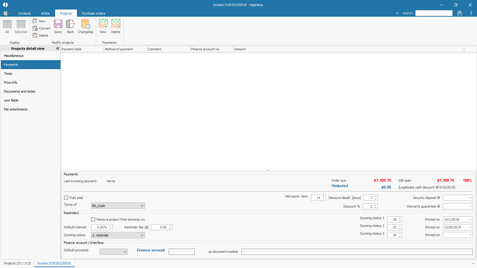 Single invoices could be excluded from the dunning run by clicking the checkbox “Remove project from dunning run” in the payment section of the project details.