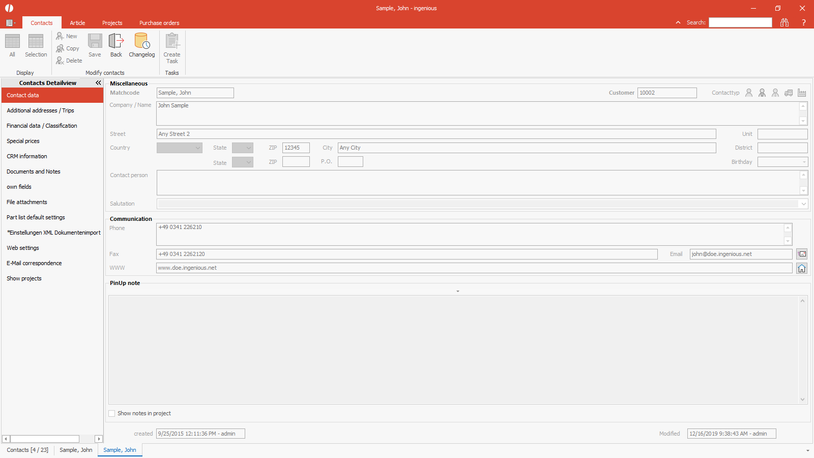 The detail view of a single data record is mostly splitted in several areas, to group specific data. In the selection area / navigation on the left side the single details will be selected.