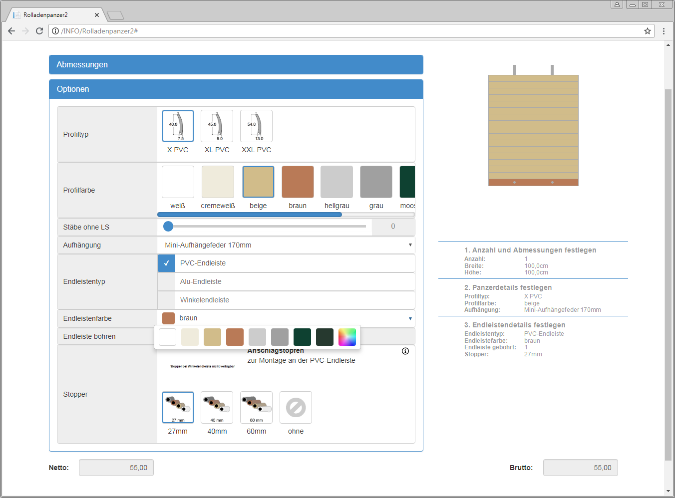 Every small or big change to the product variants in the local database is immediately active online. This saves a lot of time and money. In addition, the error rate is greatly minimized because in the Web only this variant can be configured or ordered, which is also possible in production.